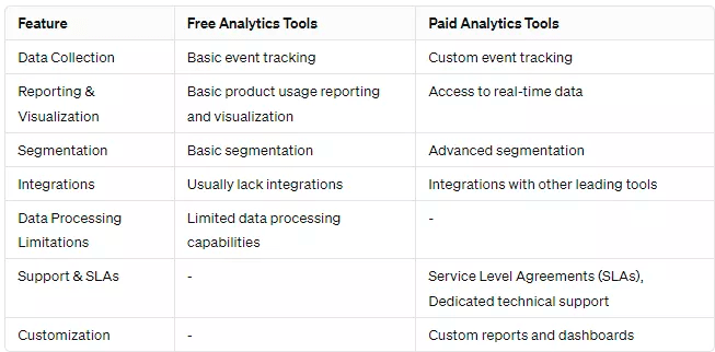 Paid tools, on the other hand, come at a significant cost but offer more advanced features like advanced segmentation, custom reports and dashboards, and other tools with niche uses, as well as providing processing for large data volume, dedicated support, and app integrations.
