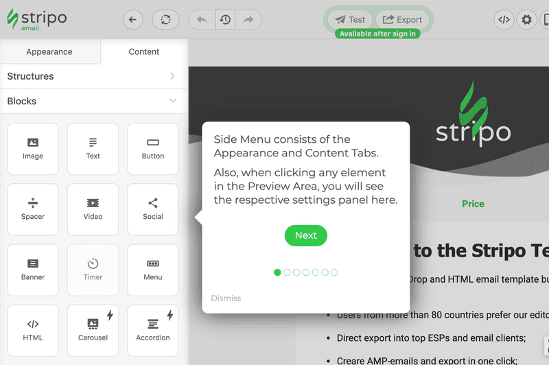 The next step in Stripo’s onboarding is to show you how the product works. It does this by guiding you through an interactive tour.