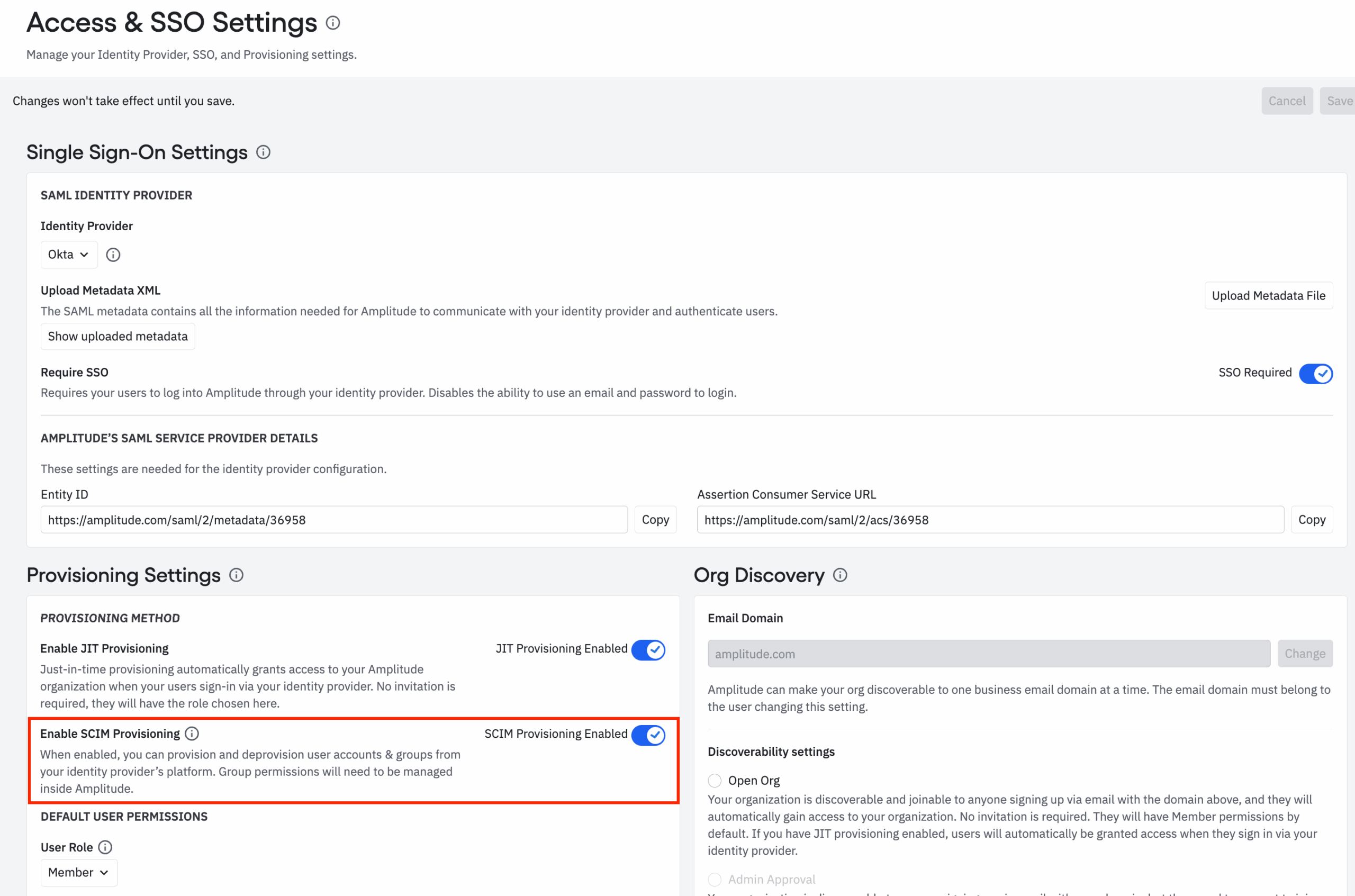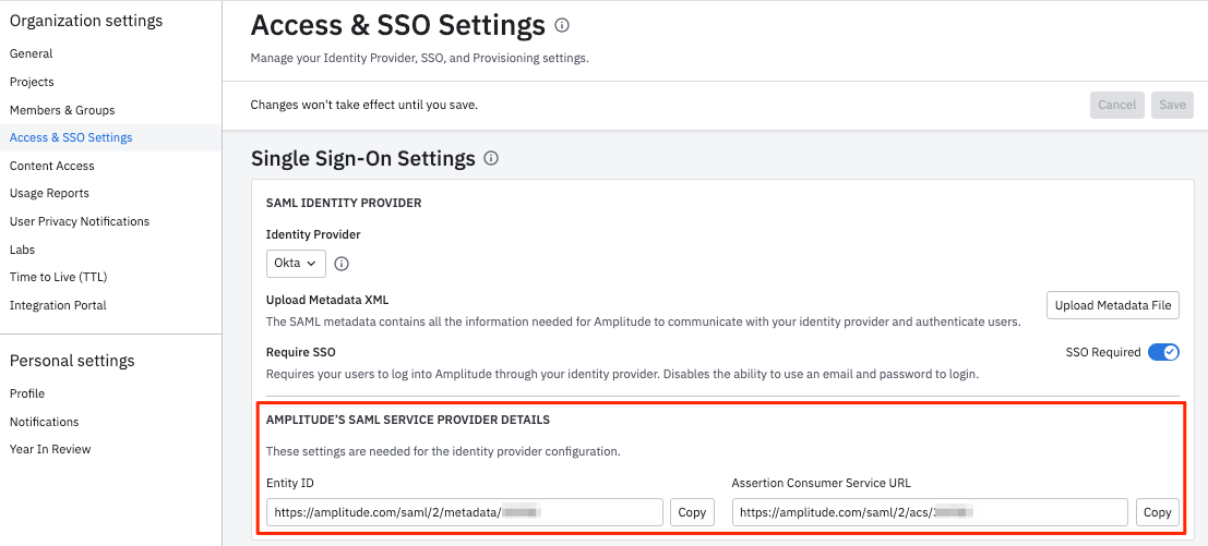- Transfer the Entity ID and ACS URL: Once the metadata is uploaded to Amplitude, the system will generate the “Service Provider” details (i.e., the Entity ID, ACS URL, etc). Copy those values and paste them into their corresponding fields in your IdP. This will complete the integration (I recommend testing it before enforcing it on the whole company).