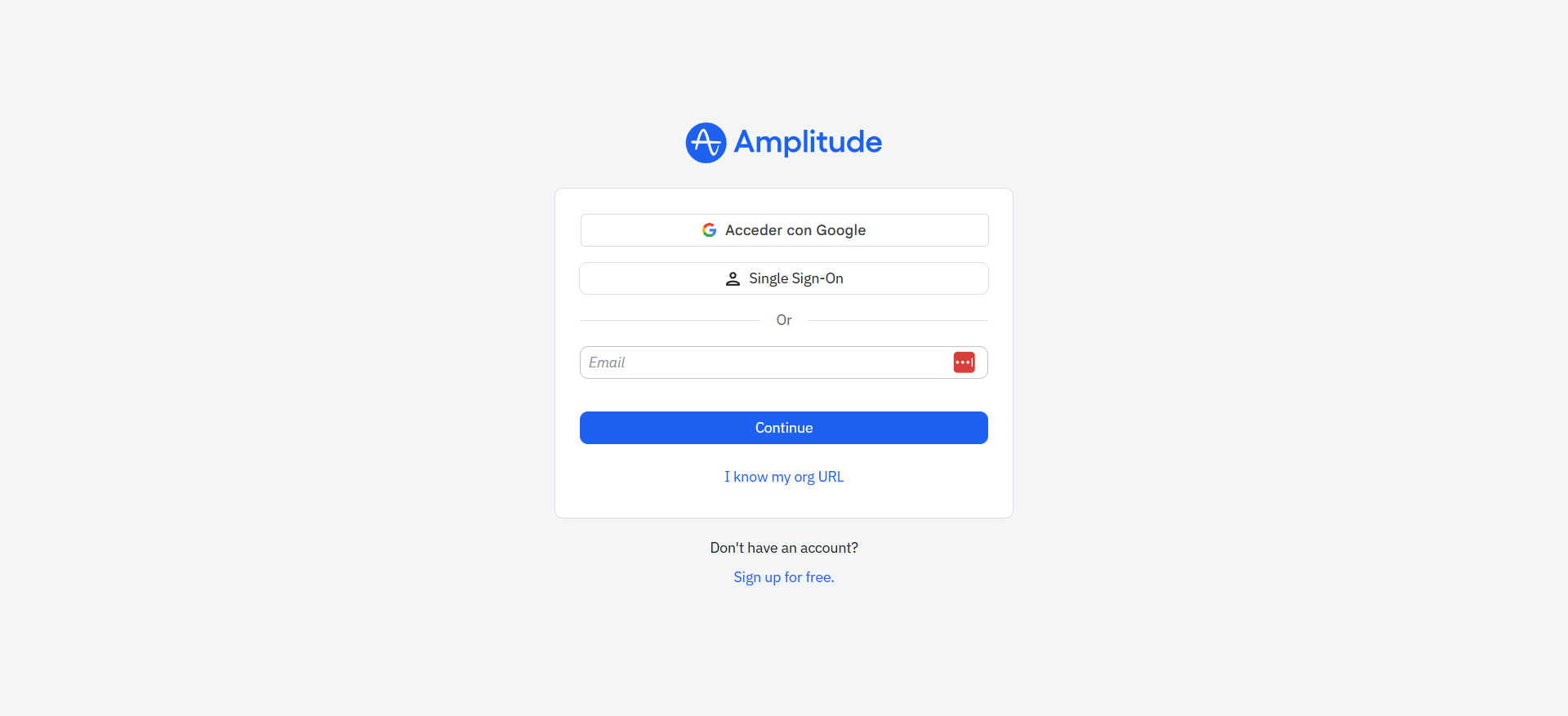 For teams using Google Workspace, Amplitude offers the “Log in with Google” button to log in with one click. You can do this as long as your Gmail address matches your Amplitude email; you can also sign up with your Google account right away.