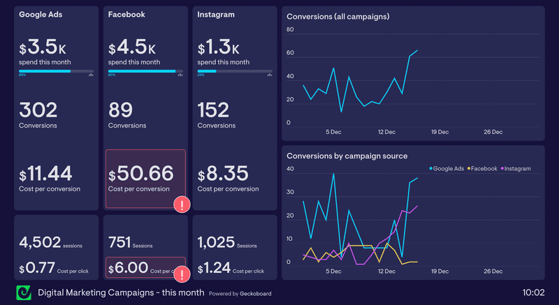 A digital marketing dashboard provides a thorough understanding of the impact of your marketing strategy on metrics like conversion rates and digital engagement. It precisely tells you where and how to improve your marketing efforts.