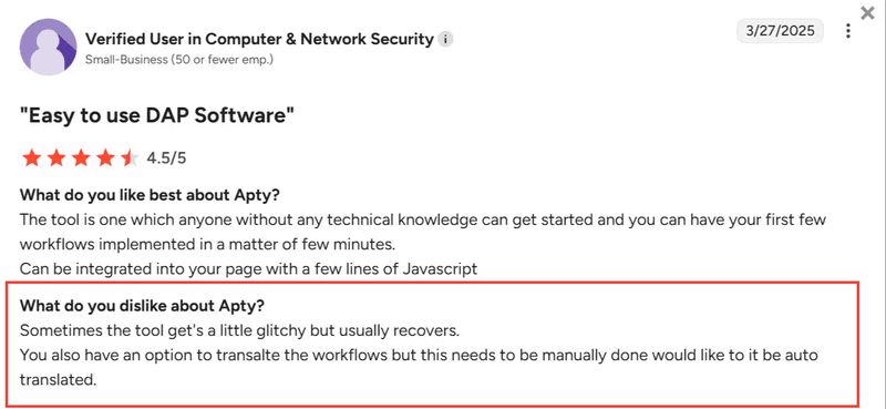 Apty’s main drawbacks show up when teams expect a modern, product-led onboarding experience rather than an enterprise adoption tool: