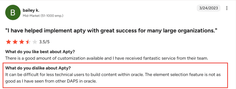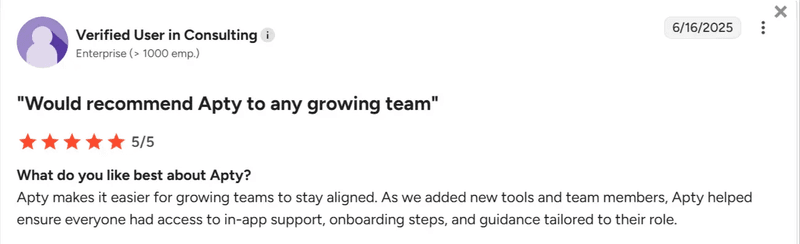 - Customer support: Users frequently call out Apty’s responsiveness and hands-on support, especially during implementation and ongoing optimization.