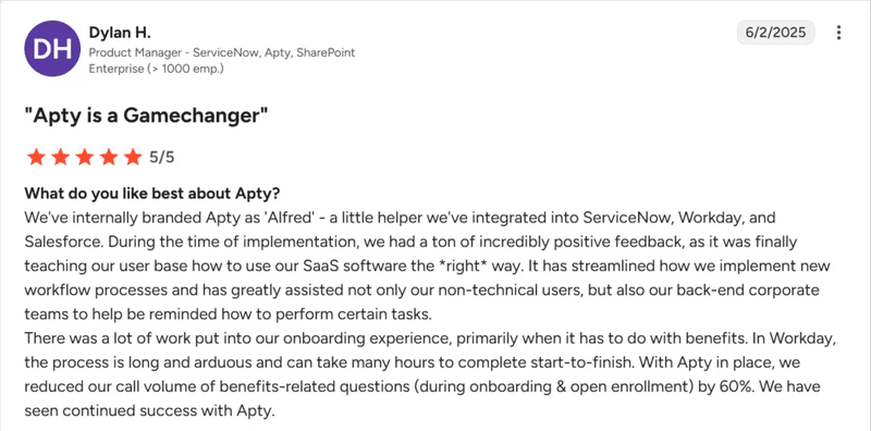 If you’re an IT manager ensuring employees complete mandatory training on Salesforce or Oracle, Apty is a functional choice. However, if you’re a SaaS product manager trying to drive adoption within your own application, you may want to take a look at Apty competitors.