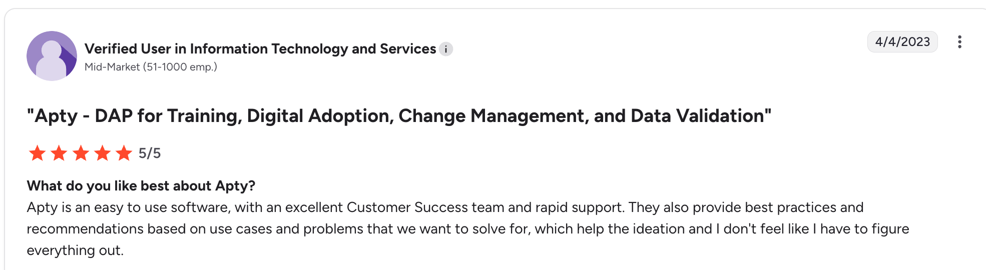 • Support for both internal and external apps: Customers appreciate Apty’s versatility and note that it is effective for both internal employee enablement and external user adoption, making it a flexible solution across multiple business scenarios.