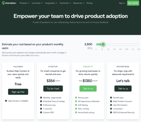 Chameleon’s pricing is based on your product’s monthly users. From the Startup plan (for small companies to get started and save) to the Growth and Enterprise plans (for larger organizations with advanced requirements) billed via invoice.