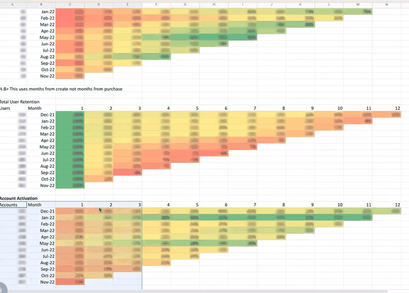 Vertical read: Scan down a specific column, such as “Month 2.” You are comparing how well you retained January’s users vs. March’s users at the same point in their lifecycle. If numbers increase as you go down, your product is getting stickier. If they drop, you’re either attracting lower-quality leads or recent product changes are creating user friction.