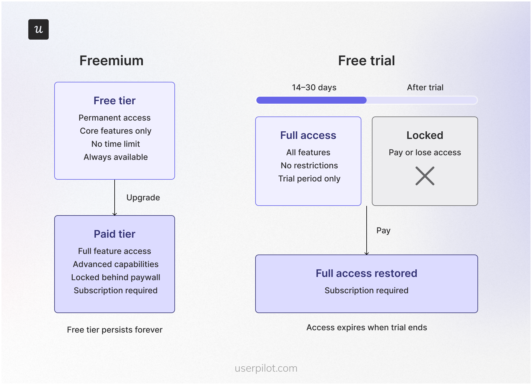 - Free trials give users full access for a defined period, typically 14 or 30 days, after which they must pay or lose access. Free trials work better for products where the full feature set is necessary to demonstrate value: a 14-day window with complete access lets users build workflows before the paywall appears.