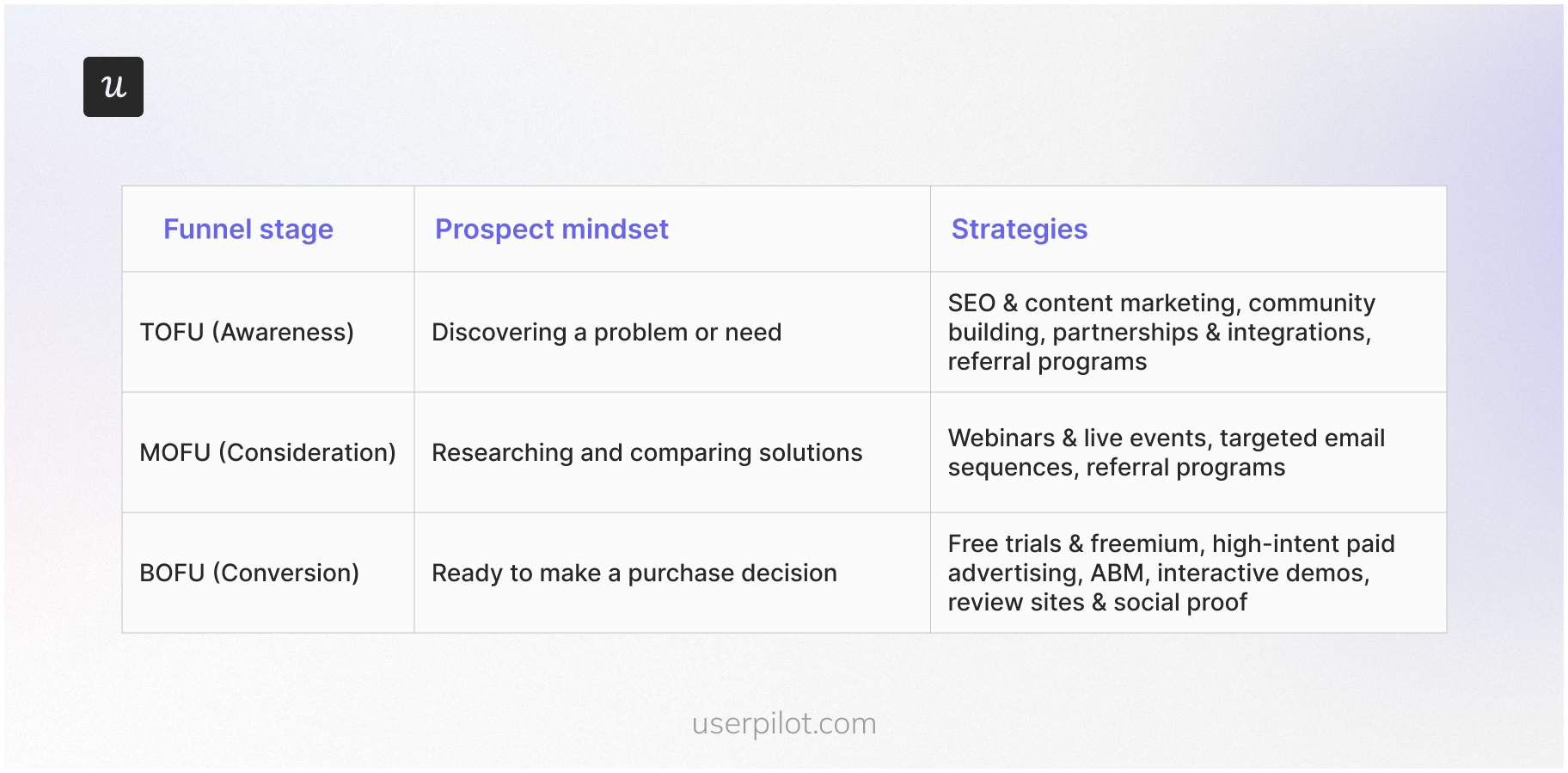 - At TOFU, prospects are just beginning to recognize a problem: This often means a product manager searching “how to improve user activation” or a founder reading about why their trial-to-paid conversion is low. Your job is to be present and useful, with strategies that put your product in front of the right people before they’re ready to evaluate anything.