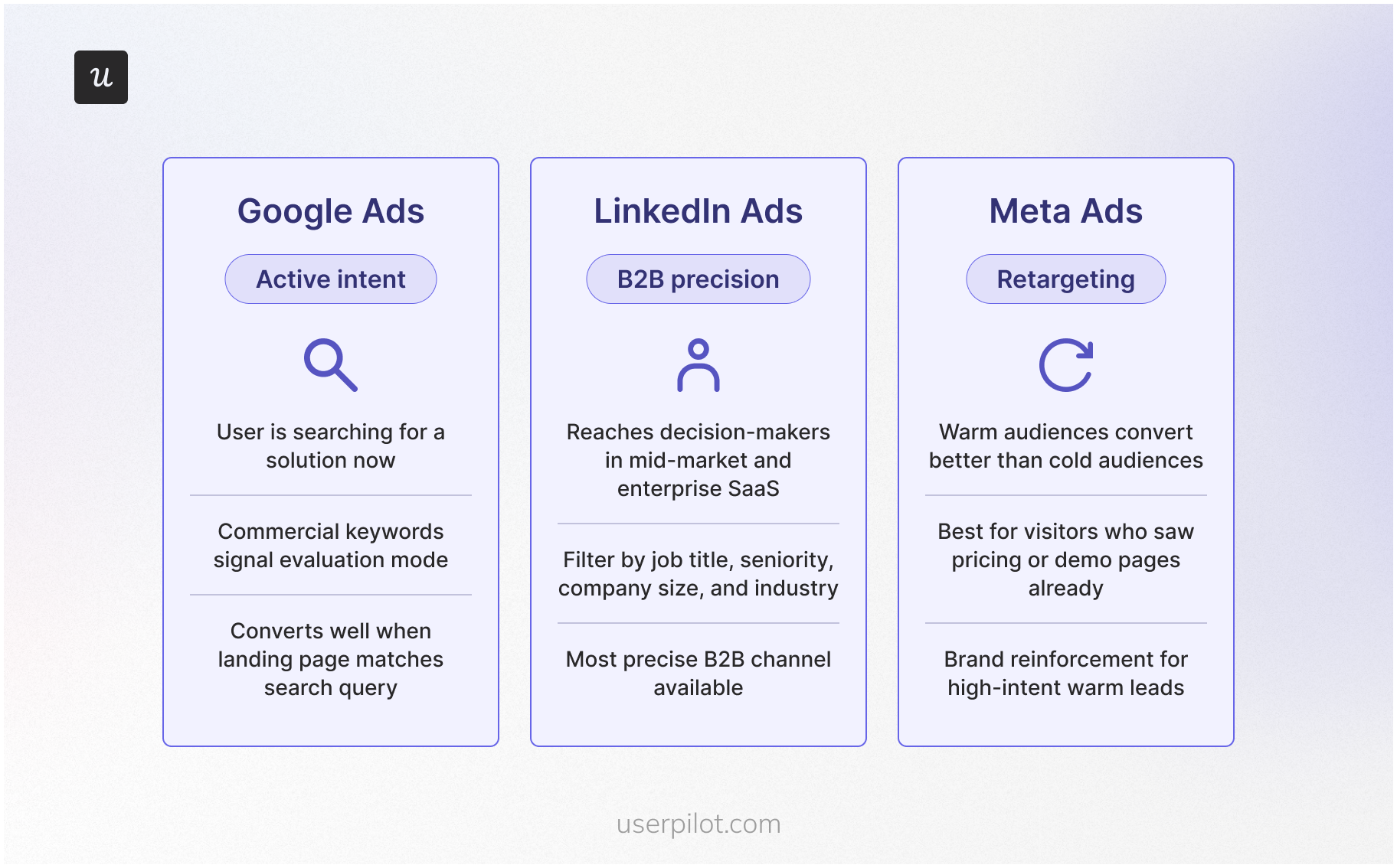 Across all three channels, prioritize retargeting audiences built from pricing and demo page visitors. These prospects have already signaled buying intent: a targeted ad at this moment often converts better and usually costs less than reaching them cold.