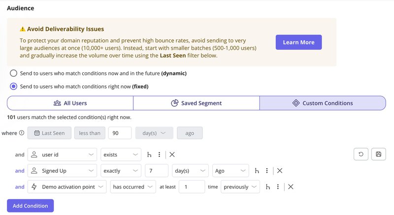 Userpilot’s email audience selection screen showing fixed user conditions and filters.