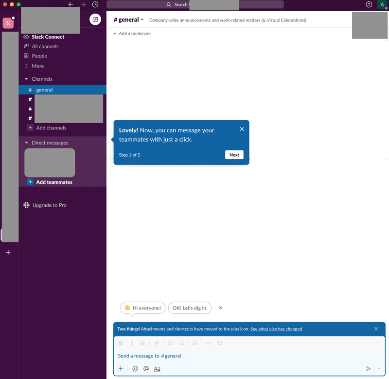 Slack uses tooltips to draw the user’s attention to the main UI elements inside the app when a user first joins a Slack Group.