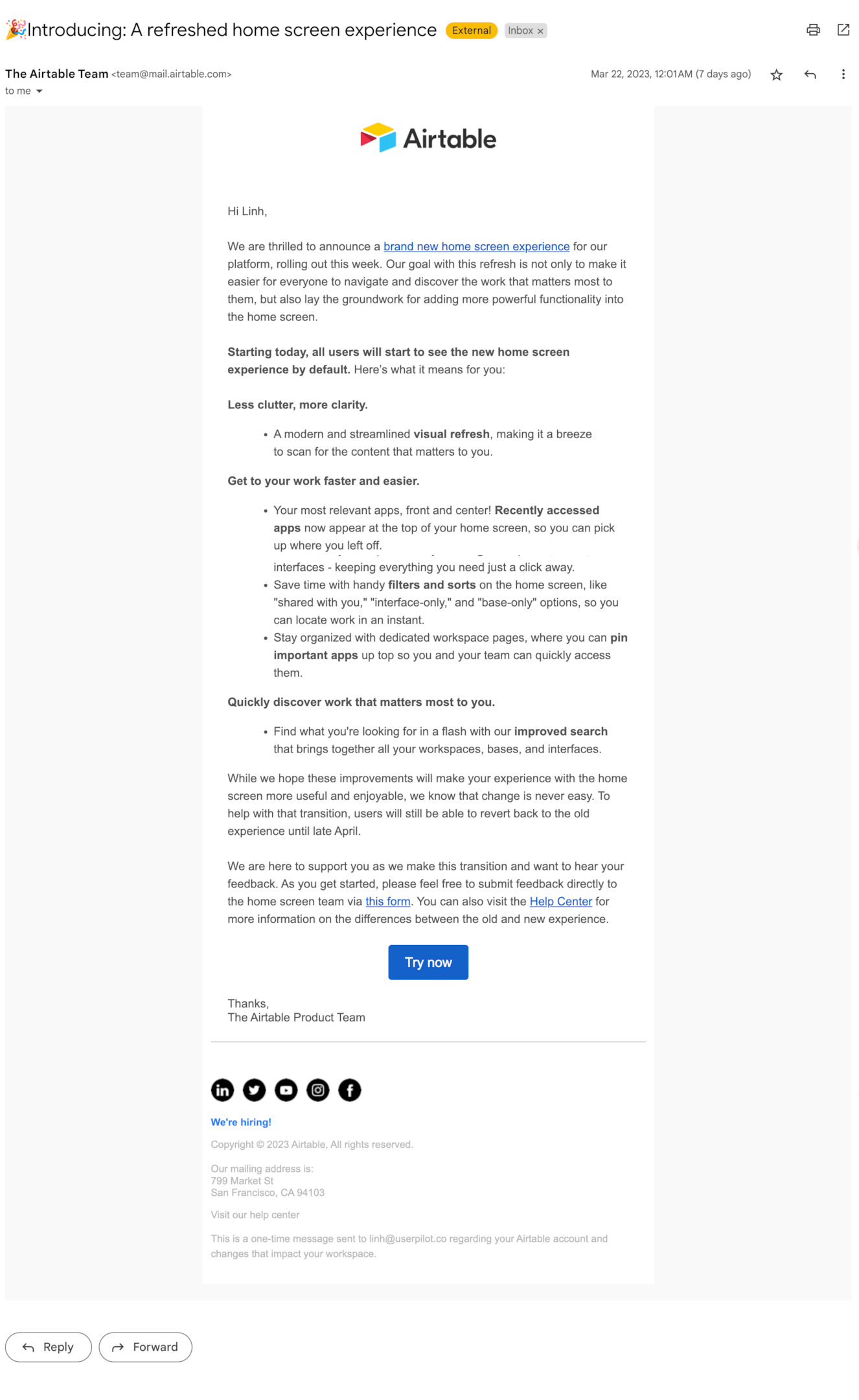 Les courriels relatifs à la sortie d’un nouveau produit sont un moyen efficace d’atteindre vos utilisateurs. Ils peuvent être particulièrement utiles pour réengager les utilisateurs qui ont cessé d’utiliser le produit, et pas seulement pour maintenir les utilisateurs existants à jour.