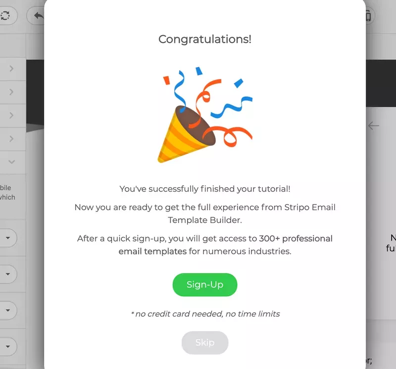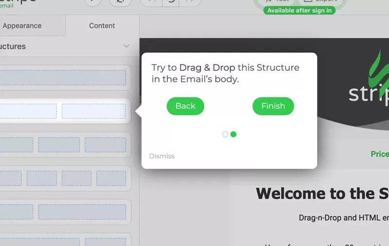 Here is a great example of how Stripo, an email design platform, allows you to try a product demo without registering. They offer a “1-click demo” on the pricing page where you can instantly try the product yourself in less than 3 minutes. It includes a series of walkthroughs and checklists implemented with Userpilot.