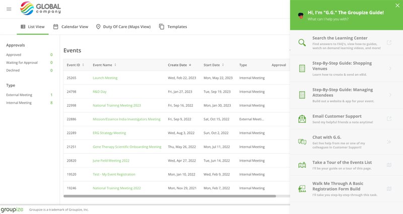 Since some of Groupize’s users are “occasional planners” – doubling as office managers or executive admins, they may need extra help. G.G. offers it through onboarding tours, step-by-step checklists (this is where Userpilot is used to help G.G. deliver this) as well as live chat, LinkedIn page, and email address.