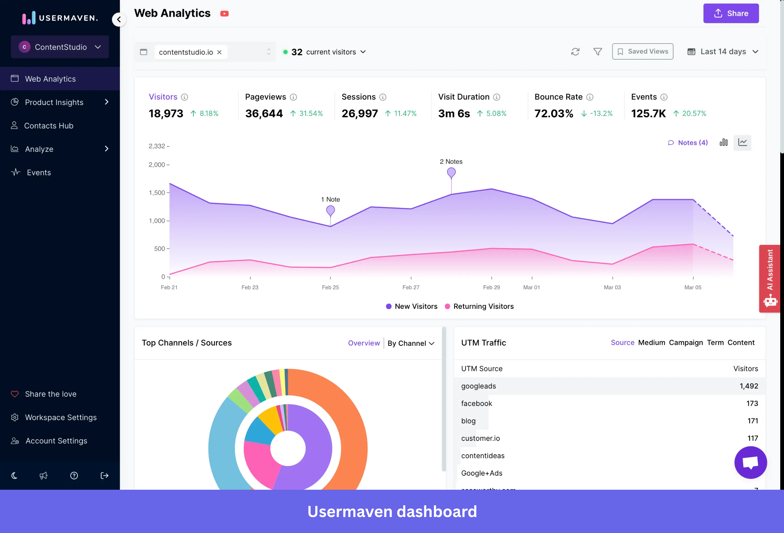Google Analytics 4 tracks how visitors find your site and what they do after they land. I use it as a foundational product analytics tool to monitor the top of our funnel. You can see which marketing campaigns bring in qualified leads and where your customer journey breaks before users sign up.