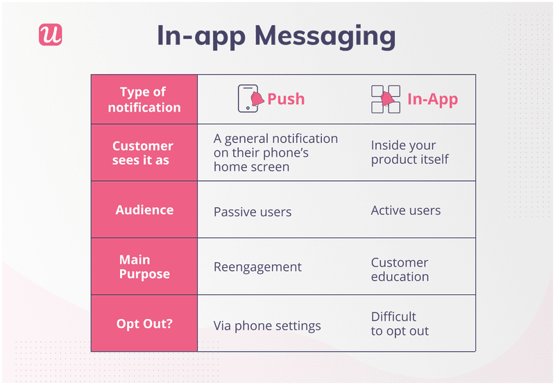 - Push notifications target disengaged audiences while the in-app notification focus is to improve the experience of engaged users