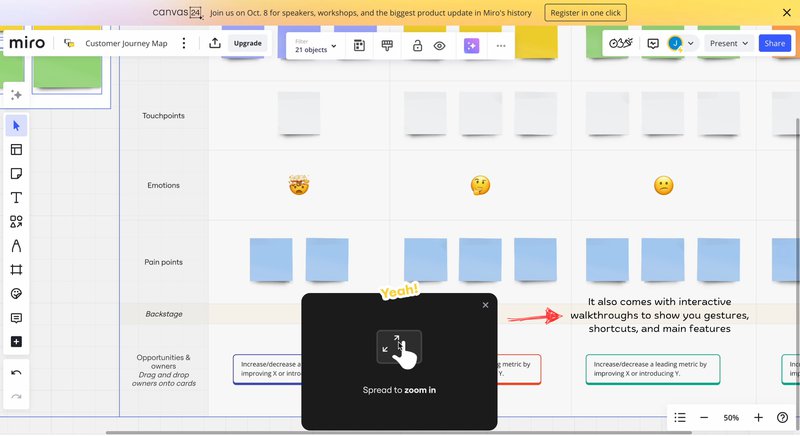 Next, demonstrating a good understanding of their product’s complexity, Miro includes an interactive walkthrough highlighting features like zooming, panning, etc., for different device types.