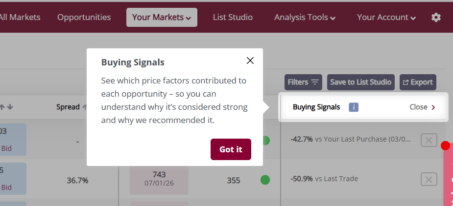 Liv-ex tooltips showcasing how to use product features.