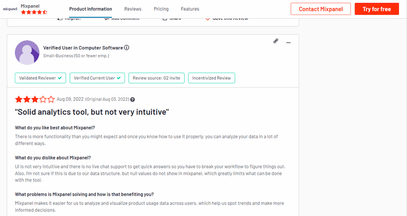 While Mixpanel has some great reviews, there are still some little downsides and quirks (same as every other SaaS tool). Here are some bad reviews of Mixpanel: