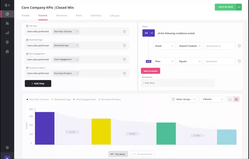 You can utilize these reports to understand your users better and gain product insights. To add to that, Userpilot also provides funnel analysis to offer you more actionable analytics.