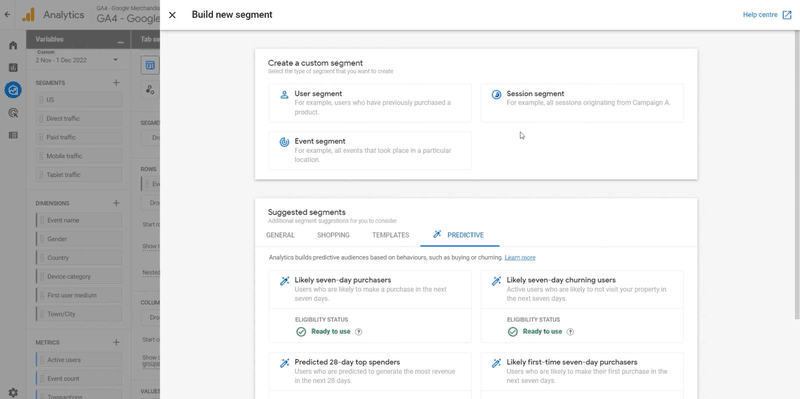 You can segment your users in two ways in GA4, either by templates or by building custom segments.
