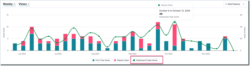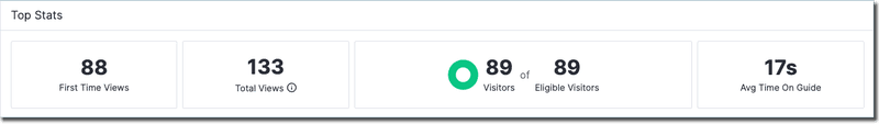 Below, a series of charts and graphs gives detailed insights into each metric. For example, you get a bar chart illustrating the guide views over time with feature usage data overlay to understand their impact
