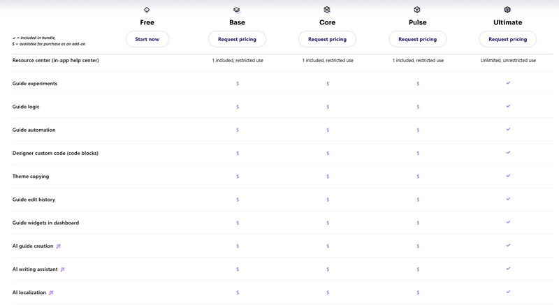 But the problem with the free plan is that you don’t have access to some features like experiments, guide logic, or AI. The in-app resource center isn’t included either.