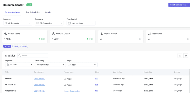 Userpilot also provides you with the needed analytics so you can see how users interact with your in-app support center.
