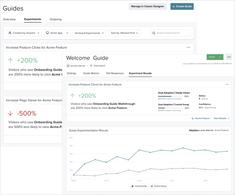 Pendo allows you to conduct A/B tests to pick the best-performing Guides. However, these are available only in the Ultimate plan, while users on other paid plans can purchase the feature as an add-on.