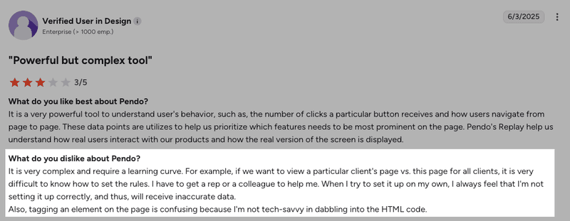 ⚠️ High technical overhead: Initial setup often requires developer support, especially for event tracking, metadata, retroactive tagging, or configuring multi-product environments. Migrating from Pendo can also be painful, with weeks or even months of manual data extraction, code rewrites, and developer hand-holding.