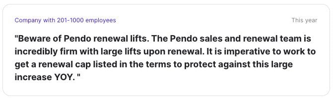 ⚠️ Non-transparent pricing: Pendo has a user-based pricing model tied to monthly active users. Costs ramp up quickly with opaque add-on fees, and customers often report renewal uplifts of 5–10% (sometimes as high as 20%), making total costs unpredictable.