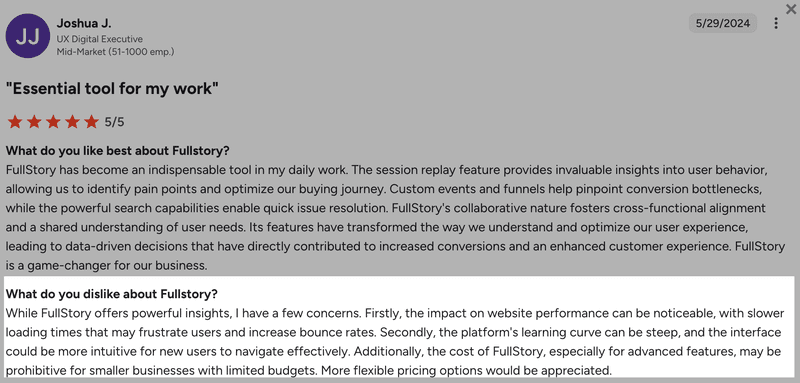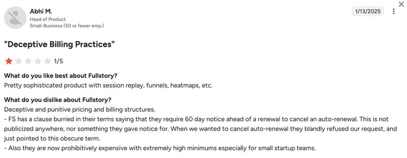 ⚠️Non-transparent pricing: Like Pendo, Fullstory’s customers complain that costs rise quickly with add-ons and renewal uplifts.