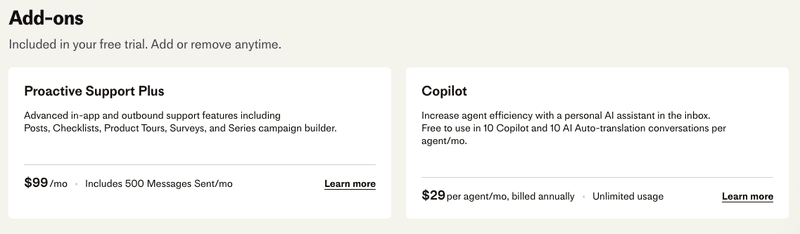 All of these plans get access to Fin (their AI agent), which costs $0.99 for each ticket resolution regardless of your plan. Then you have the add-ons, which include: