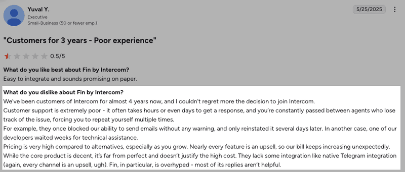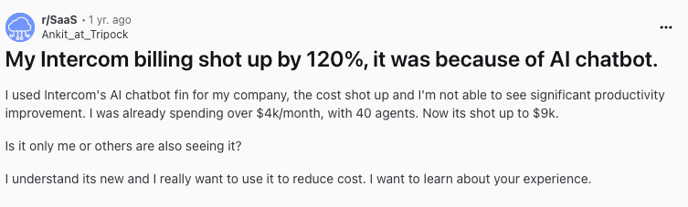 ⚠️ Unpredictable costs: Pricing depends on seats, Fin resolutions, add-ons, and messages sent, which makes it unpredictable. Some users report their billing going up with no prior notification.