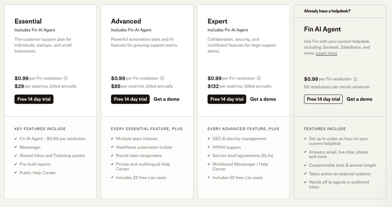 - Advanced ($85/seat/mo.): Everything in Essential plus multiple team inboxes, a workflow automation builder, and a multilingual Help Center.