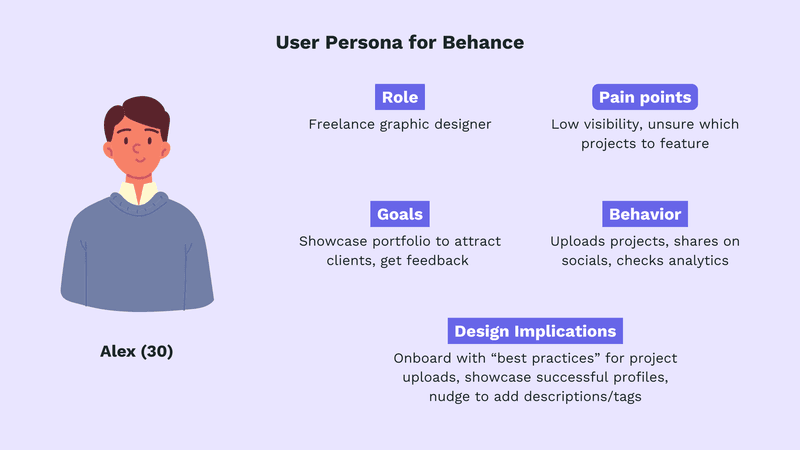 Takeaway: Alex reflects a customer persona in Behance’s target audience: creative professionals driven by exposure, feedback, and community engagement. His persona helps clarify what matters to potential customers looking to grow a freelance design career.