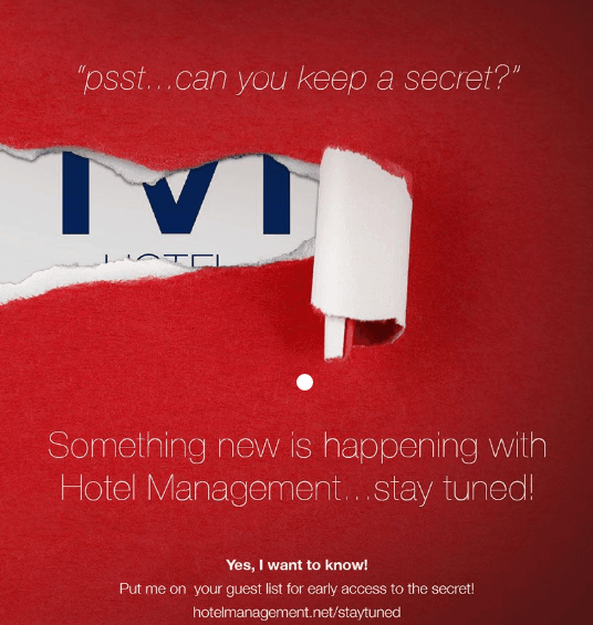 Although not a SaaS example, Hotel Management.net is a brilliant example of teasing your audience and building anticipation.