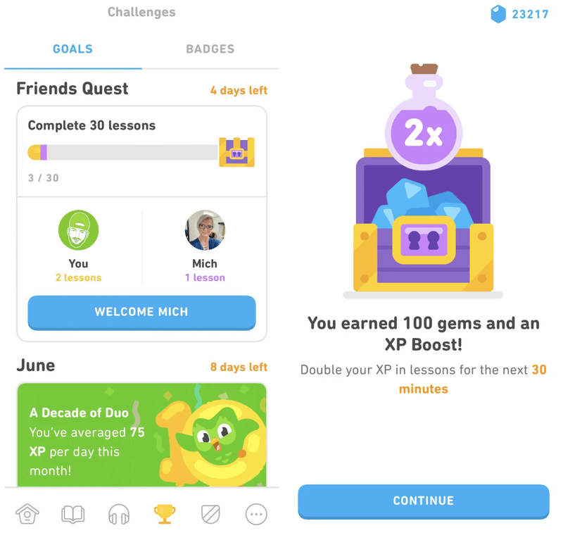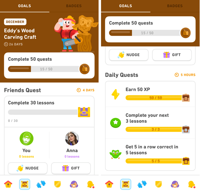 - Personalized elements based on each user’s progress: Users with longer streaks are often given more challenging quests in monthly challenges. Also, daily and friend quests are customized according to the user’s language course and level, making the experience feel a bit unique for each learner.