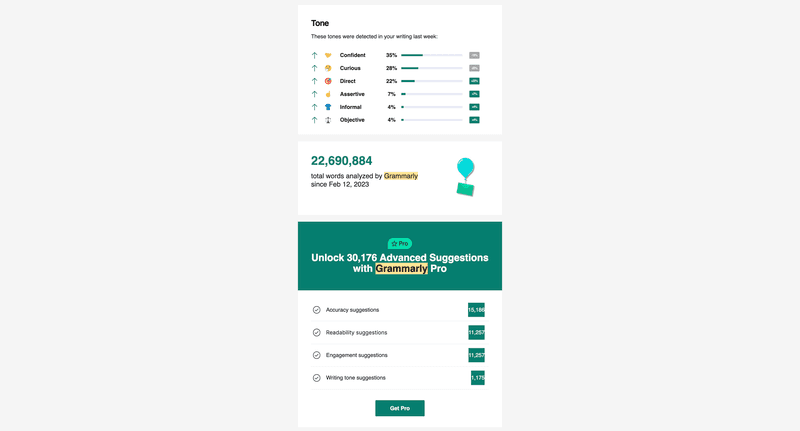 With behavioral data, Grammarly crafts weekly email updates that provide insights into the user’s writing habits, productivity, and language mastery. And include: