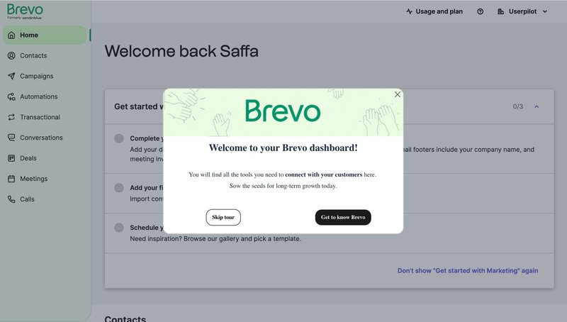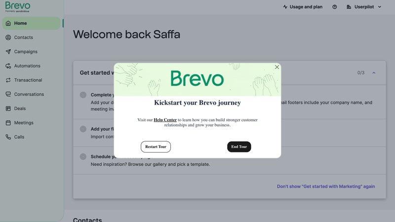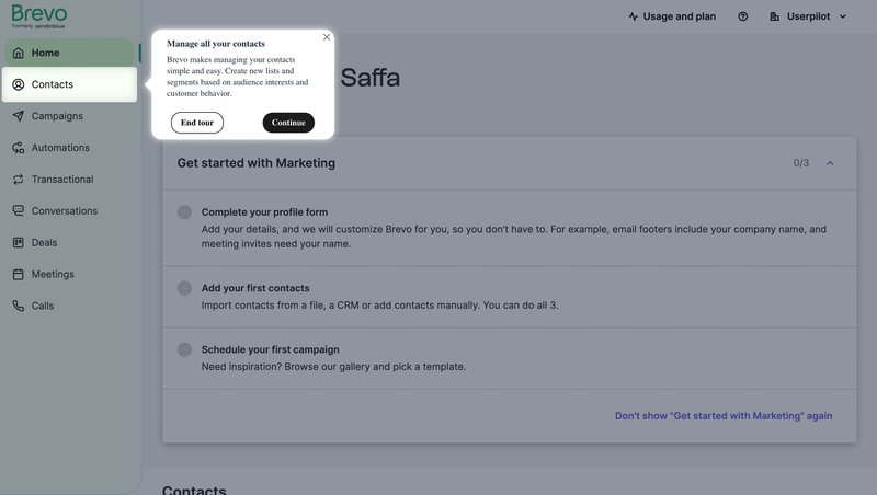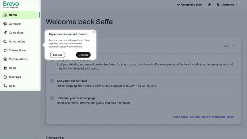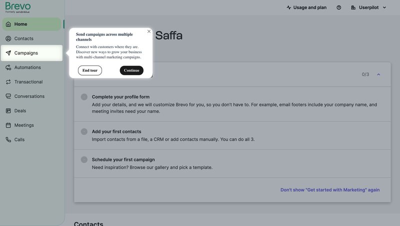 Brevo uses progressive disclosure: one tooltip at a time, gently introducing users to features like multichannel messaging and contact management.