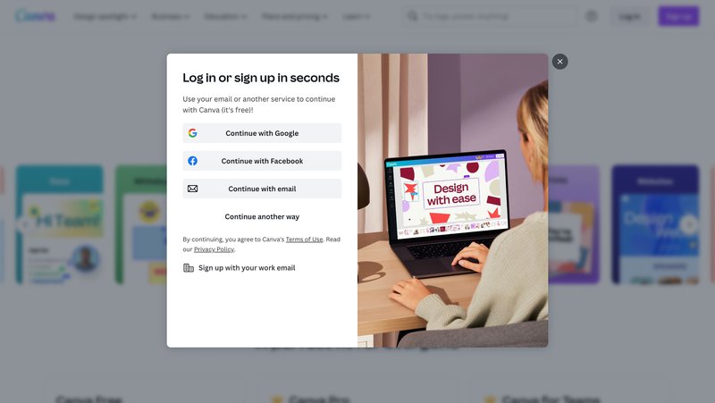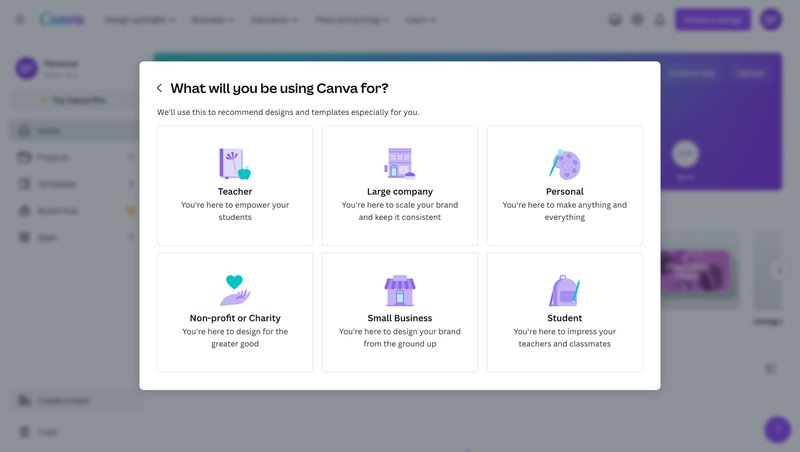 Canva starts with frictionless SSO login, followed by a quick survey that personalizes your dashboard. Smart move.