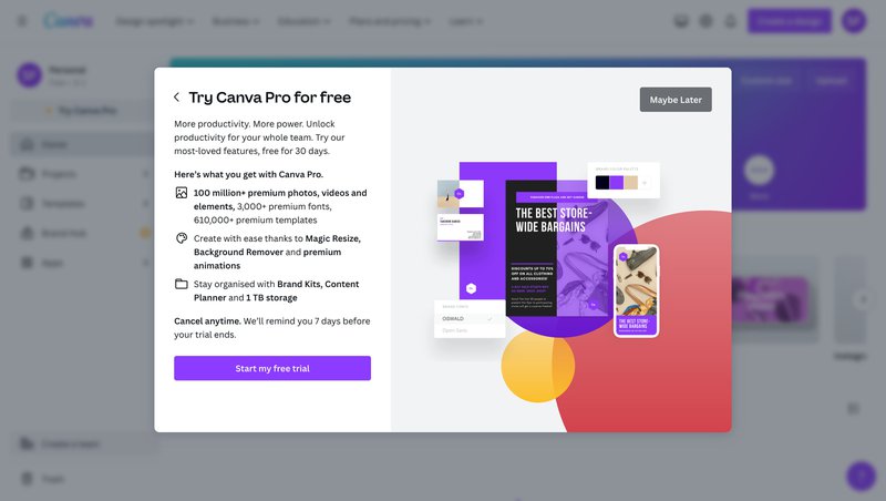 Then comes a reverse trial, letting users test Canva Pro from day one. That’s a great way to nudge upgrades.
