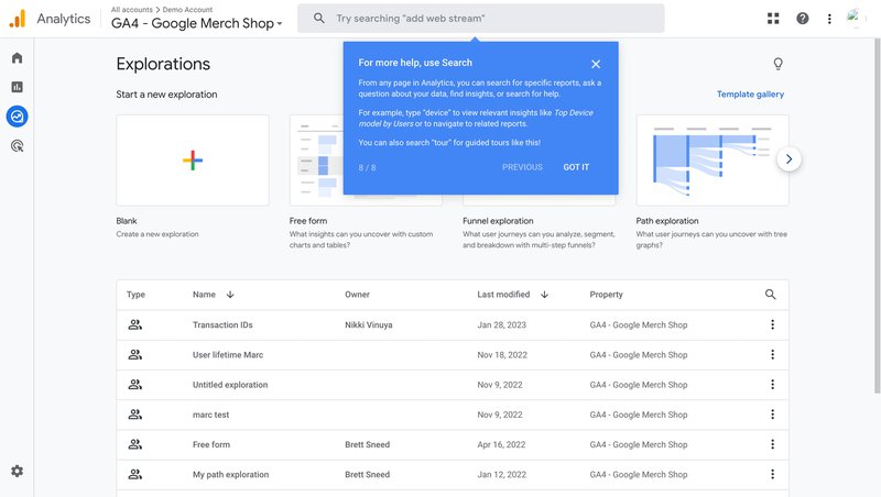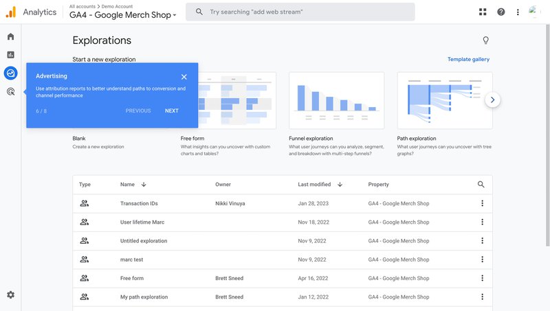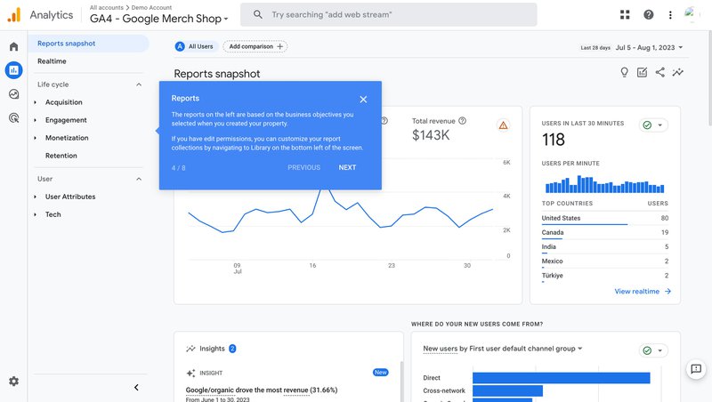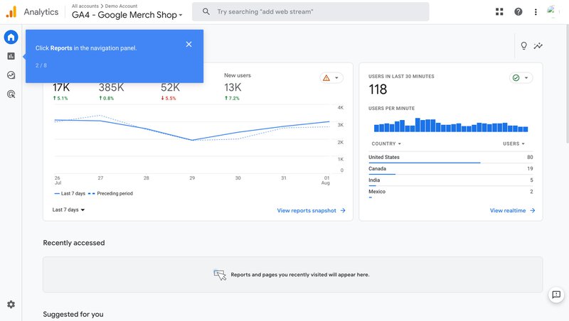 The GA4 tour consists of 8 steps. It starts on the Home page with an introductory message highlighting the page’s quick-access metrics.