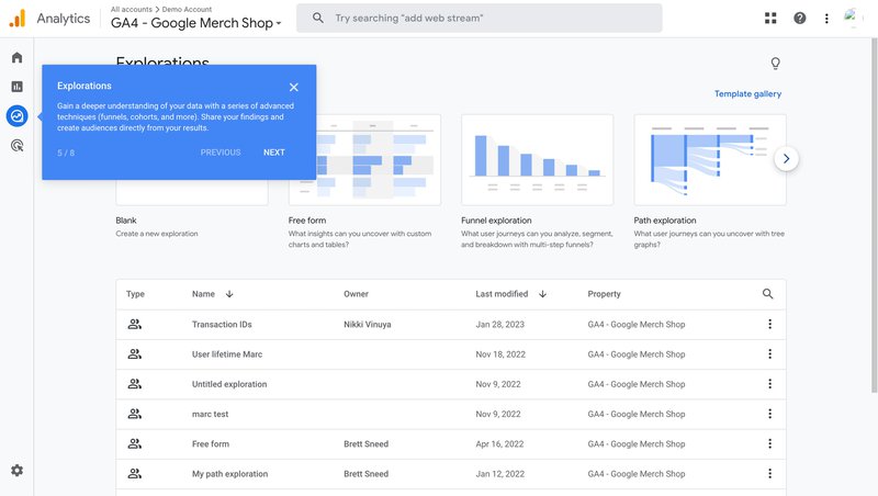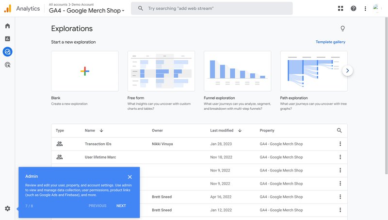 Subsequent tooltips guide users through the key sections like Reports, Explorations, or Admin in the navigation panel and explain their application and benefits.