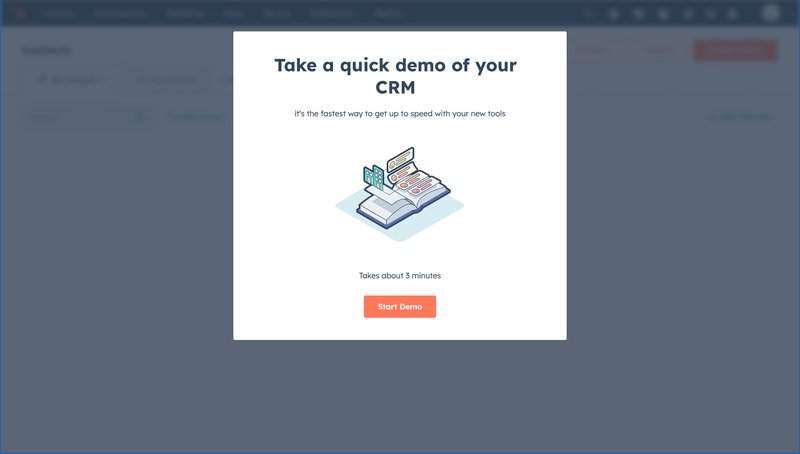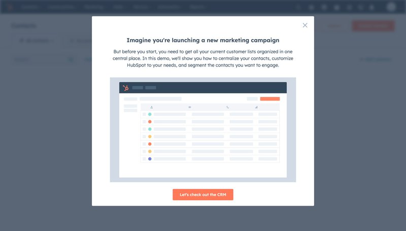 HubSpot onboards new users through a demo account where they can learn how to use the CRM’s key features without worrying about making mistakes: zero risk, just learning.