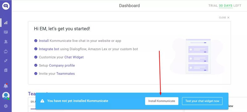 Kommunicate uses banners, checklists, and walkthroughs to drive adoption. The tour starts with a banner encouraging users to install the tool.