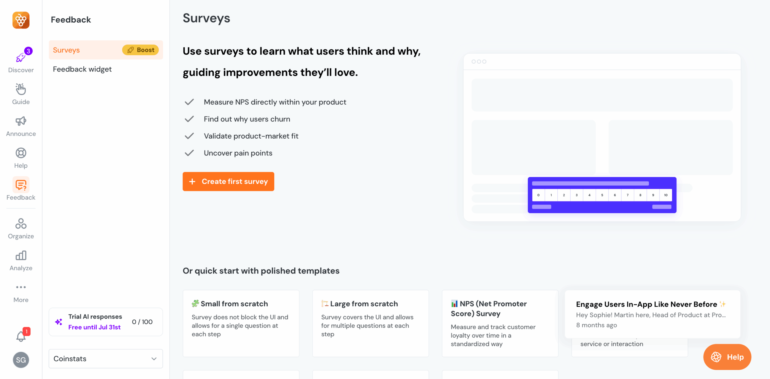 - NPS surveys to track customer loyalty over time. Responses can be tagged and segmented, helping you identify trends across different user groups and stages.