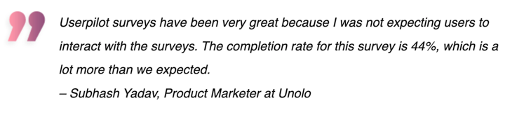 “We’ve had a fantastic experience with Userpilot. The analytics and research (NPS and surveys) capabilities are top-notch, giving us clear, actionable insights that help us understand user behavior and improve our product experience. The onboarding features have been a game-changer for us. We’ve saved a significant amount of development time by being able to easily create, update, and remove banners and walkthroughs without engineering support.” – G2 reviewer