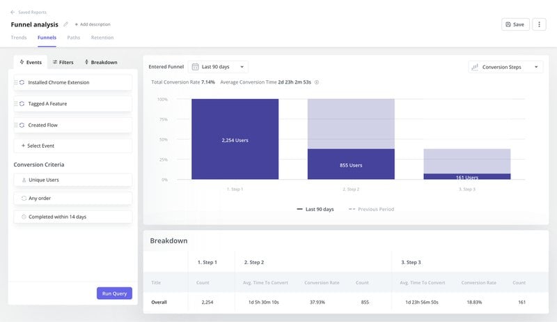 - Funnel analysis tracks user churn and identifies drop-offs in the customer journey.